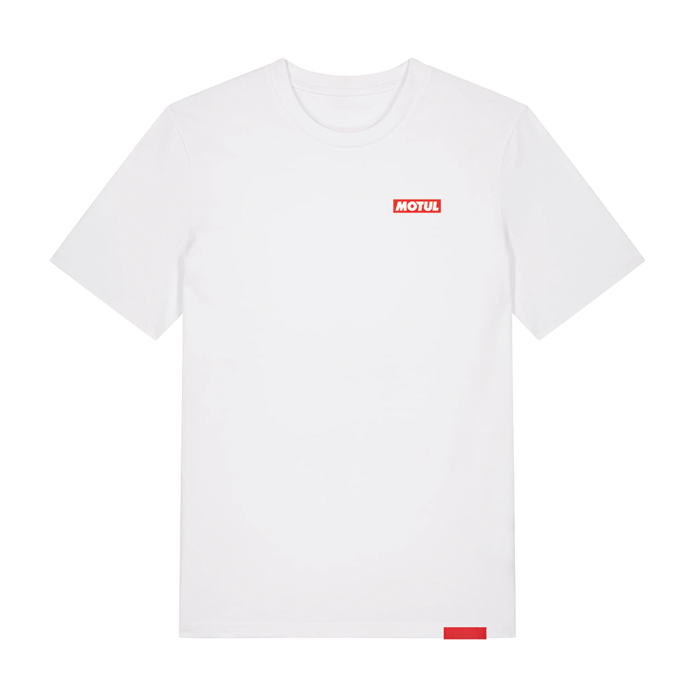 A comfortable white cotton crewneck with the Motul logo to the left chest and a pattern design to the back, perfect for everyday wear.