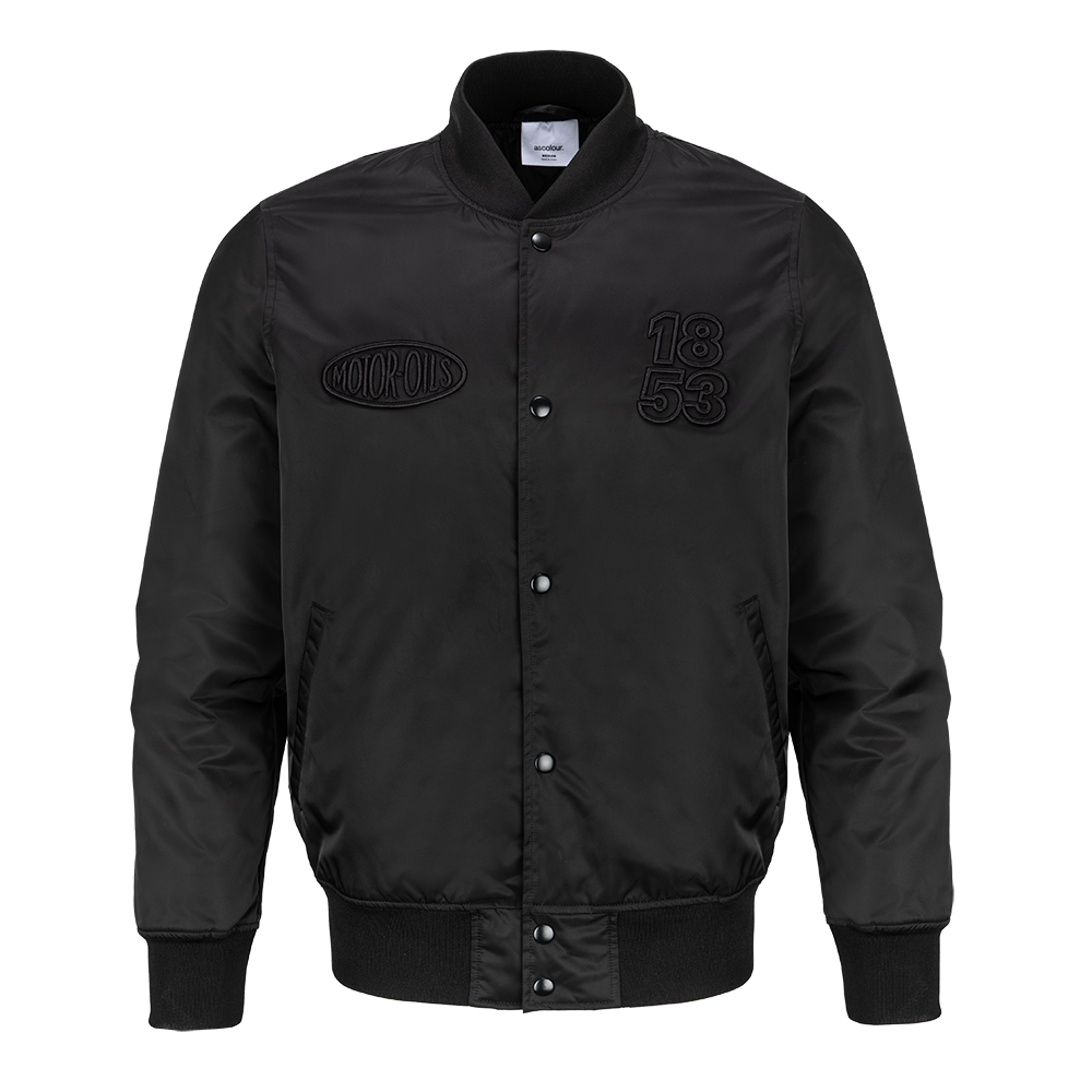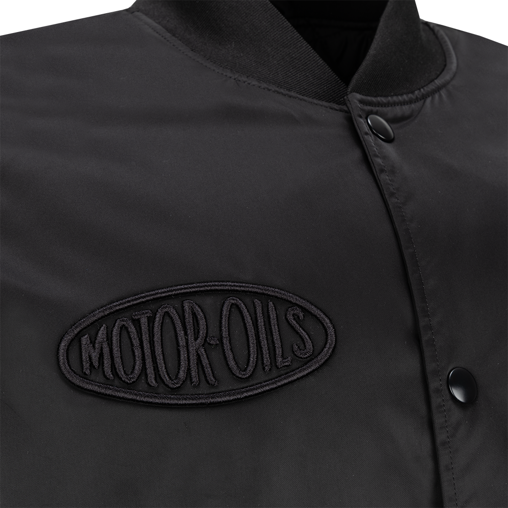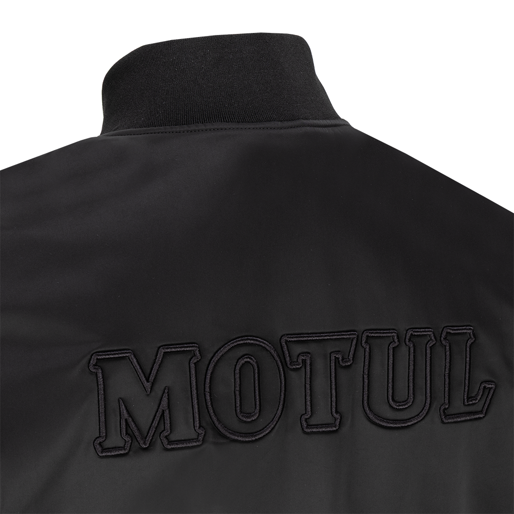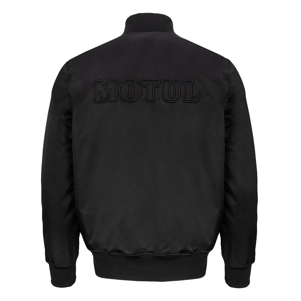Offering timeless style, this black bomber jacket features vintage Motul decoration embroidered to both the front and the back in subtle black-on-black.