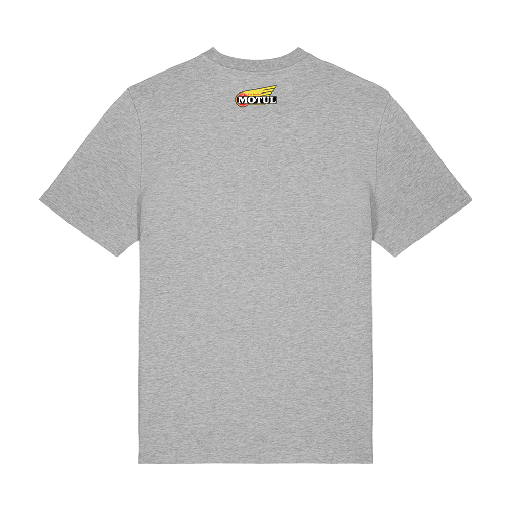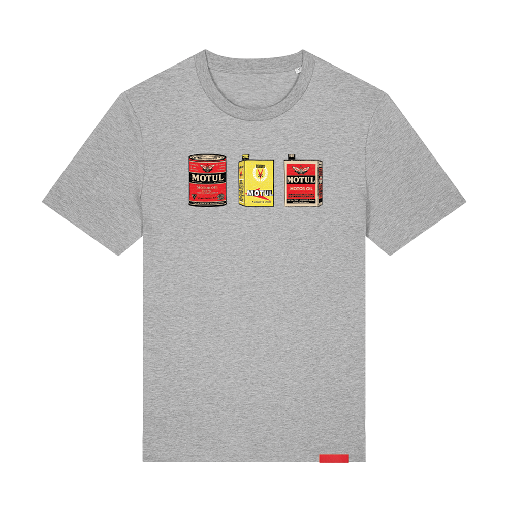 This comfortable cotton crewneck in grey features a vintage Motul oil can design across the chest.